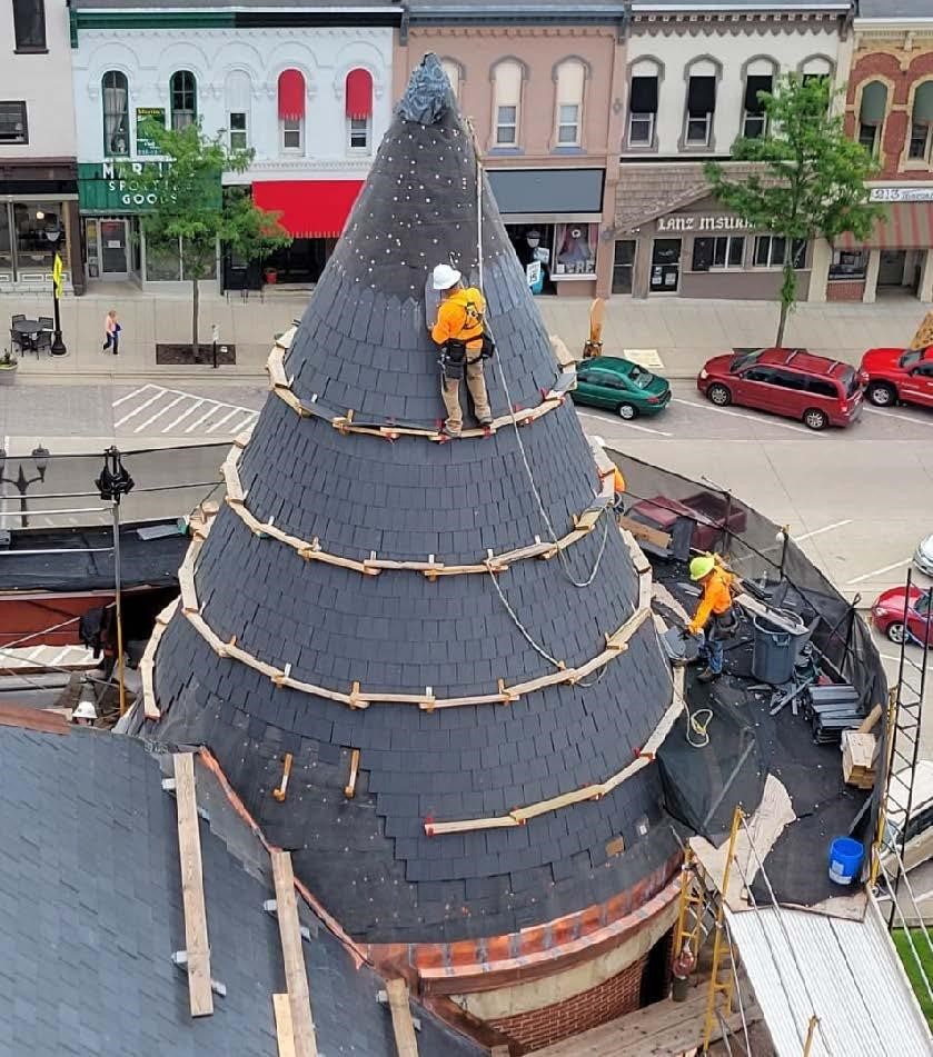 The project included removing the clock tower’s pyramid-shaped roof structure by crane and storing it on the courthouse grounds until it was rebuilt and replace into position before having the new slate roof installed.