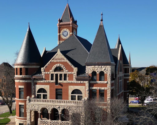 The classic Richardsonian Romanesque-style Courthouse was built in 1891 from red brick and limestone. It is a large, asymmetrical two-and-a-half story structure that includes two steeply sloped round turret roofs, a steep slope square pyramid turret, as well as a 120-foot square ‘clock tower’ with a steep pyramid roof — all typical features of the architectural style.