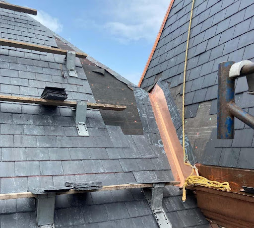 Historic renovations are always challenging, especially when the building is listed on the National Register of Historic Places. But when the renovation requires part of the building to be removed, stored on site, repaired and re-installed to the original specifications, and new slate to be installed on steep sloped round turret roofs, that takes the project to a whole new level.